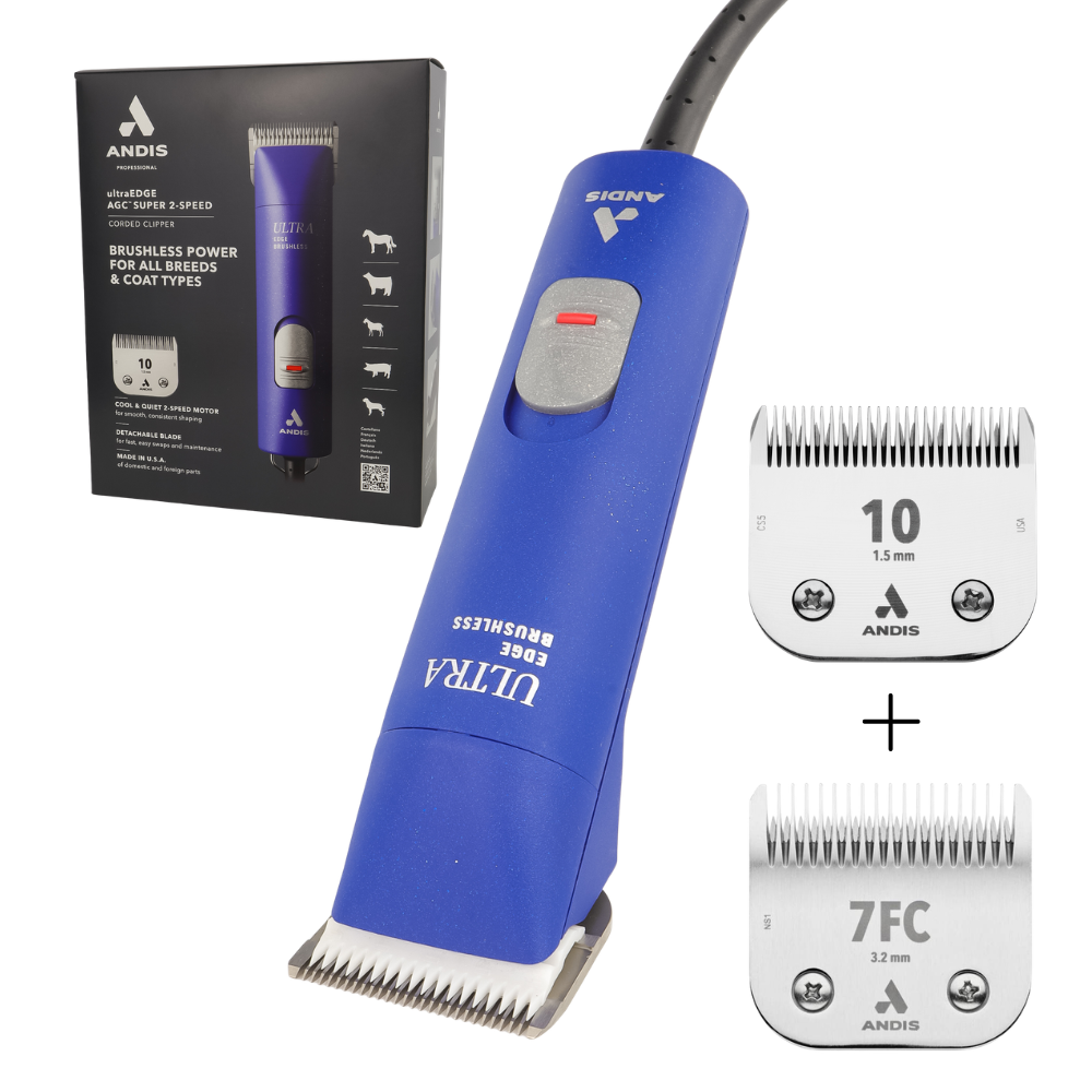 Profesjonalna maszynka groomerska Andis UltraEdge AGC Super 2-Speed w tej ofercie dostępna jest w rozszerzonym zestawie z dwoma ostrzami ceramicznymi. Oprócz standardowego ostrza Andis nr 10 (1,5 mm) w komplecie znajduje się również dodatkowe ostrze 7FC (3,2 mm), które świetnie sprawdza się przy strzyżeniu większych powierzchni sierści.