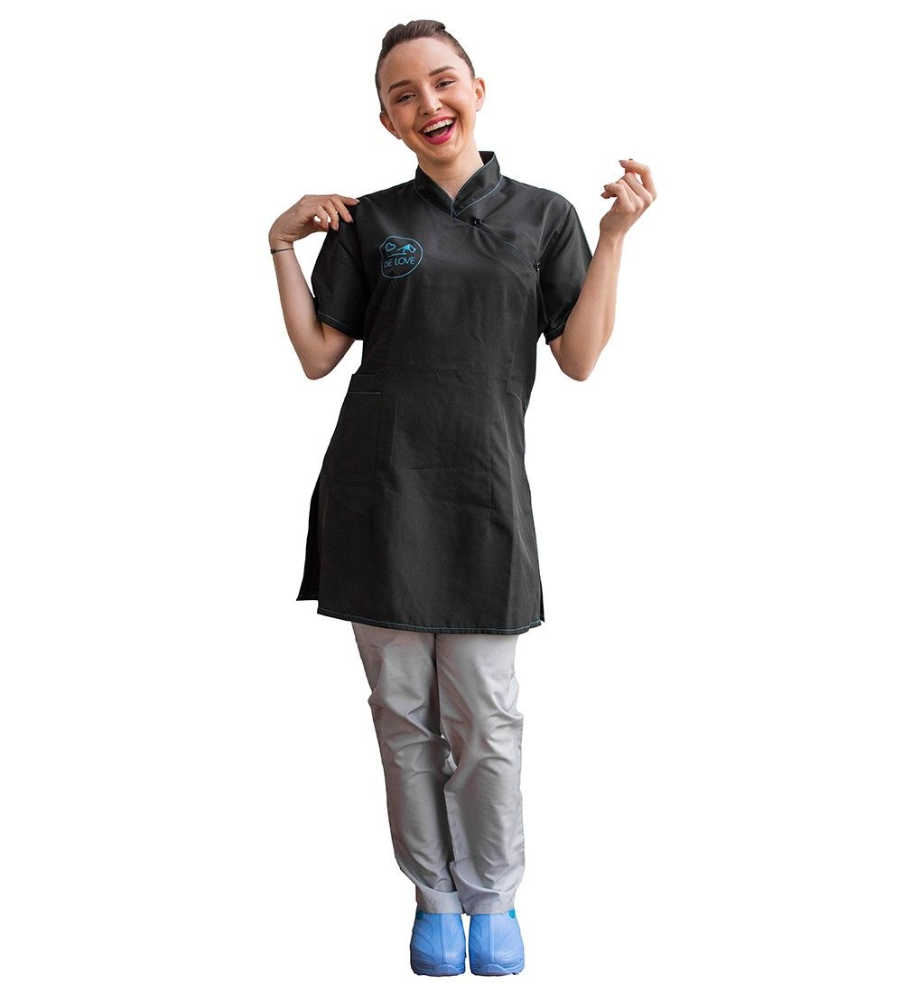 Tunika wykonana z wysokiej jakości tkaniny dedykowanej groomerom. Materiał ten cechuje się trwałością, łatwością w czyszczeniu oraz szybkim schnięciem. Specjalnie zaprojektowana tkanina skutecznie zapobiega przyleganiu sierści do powierzchni tuniki. Dzięki temu utrzymanie czystości i schludnego wyglądu jest znacznie łatwiejsze. Wykorzystane innowacyjne technologie, sprawiają, że tunika jest odporna na plamy.