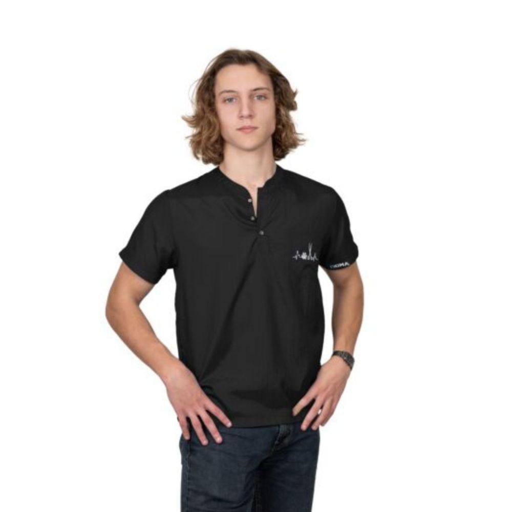 Koszula ma małą kieszeń z przodu i kołnierzyk z trzema guzikami dla stylu i łatwości noszenia. Dwa krótkie, zaokrąglone boczne wcięcia zapewniają komfort i swobodę ruchów podczas długich sesji pielęgnacyjnych lub aktywnej pracy. Jest to stylowa i wygodna koszula na każdą okazję.