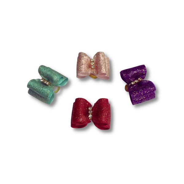 Dekoracyjna kokardka z brokatem i cyrkoniami w kilku kolorach do wyboru. Kokardka przymocowana do sylikonowej gumki. Pięknie prezentuje się na każdym psie.