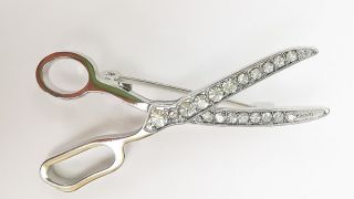 Piękna, ozdobna broszka z cyrkoniami w kształcie nożyczek, stanowi piękny dodatek dla osoby związanej z fryzjerstwem czy groomingiem.