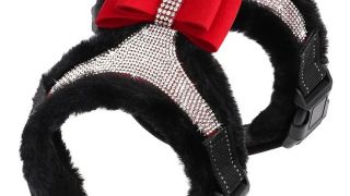 Regulowane szelki dla małego psa, zdobione błyszczącymi kamyczkami oraz czerwoną kokardką z weluru, pięknie prezentują się na pupilu. Pod kokardką uchwyt do zapinania smyczy, podszyte miłym w dotyku materiałem