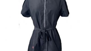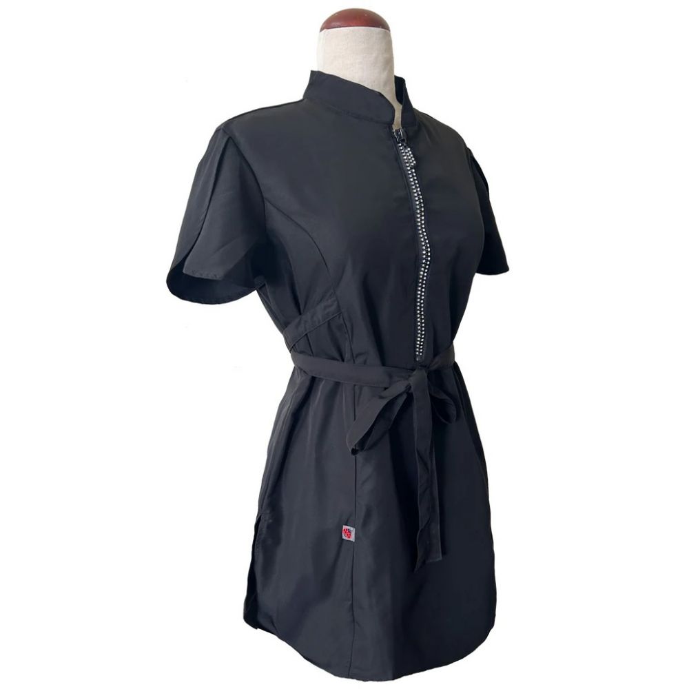 Klasyczna czarna tunika z półzamkiem i cyrkoniami – elegancja spotyka funkcjonalność! Idealna dla groomerów zwierząt, fryzjerów i innych profesjonalistów, którzy cenią styl w pracy.