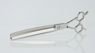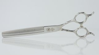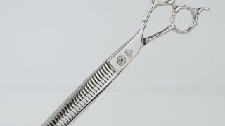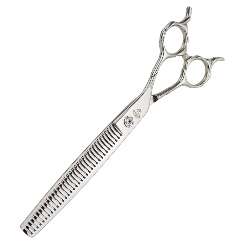 Nożyczki chunkersy Diamond Scissors oferuje 7,5" do profesjonalnej pielęgnacji psów, wykonane z wysokiej jakości japońskiej stali VG10, co zapewnia ich trwałość i ostrość. Nożyczki posiadają podpórki pod palce, umożliwiające wygodną pracę zarówno osobom prawo-, jak i leworęcznym.