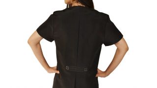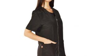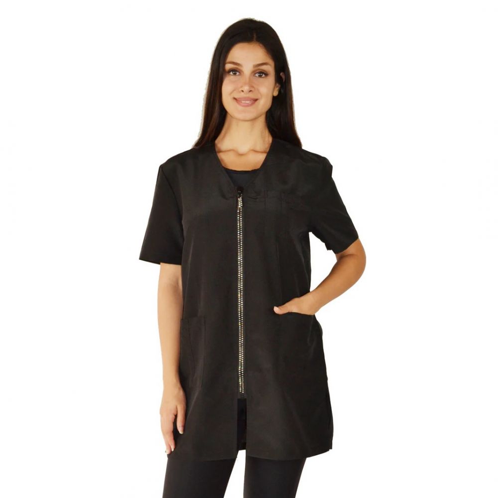 Idealna dla fryzjerek, kosmetyczek, stylistek paznokci i groomerów zwierząt. Lekka, wodoodporna, odpychająca włosy, odporna na wybielacz, plisowany tył dla dodatkowego komfortu, zamek z cyrkoniami, ozdobny pasek z tyłu, dwie kieszenie z przodu.