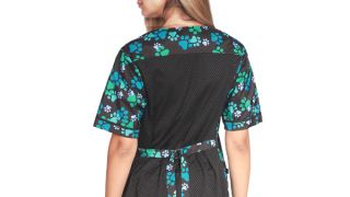 Fartuch posiada piękny kolorowy, modny wzór psie łapki.