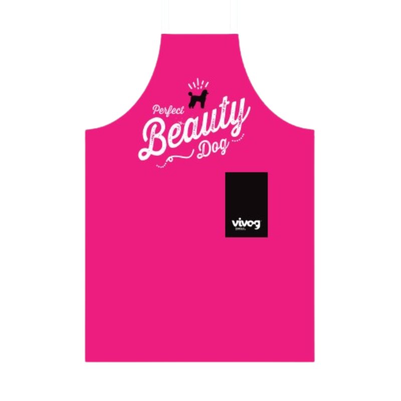 Różowy, wodoodporny fartuch groomerski Vivog, przeznaczony dla osób zajmujących się pielęgnacją psów – w szczególności groomerów oraz hodowców.
