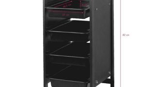 Dwustronny pomocnik fryzjerski w kolorze czarnym, wyposażony w cztery szuflady oraz uchwyty na akcesoria fryzjerskie. Solidna konstrukcja gwarantuje długotrwałe użytkowanie.