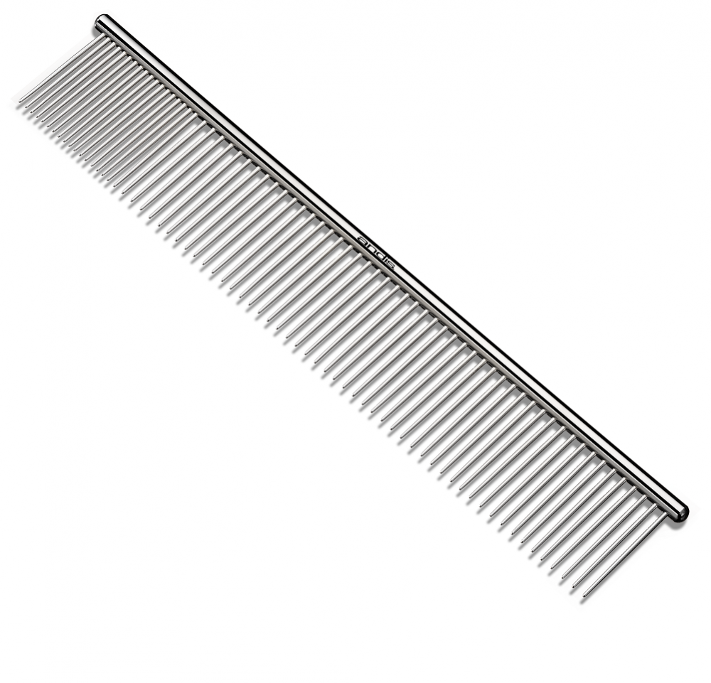 Metalowy grzebień firmy Andis  o długości 25 cm, natomiast długość zębów wynosi 3,7 cm.