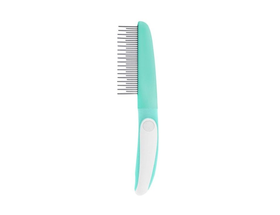 Metalowy grzebień z obracającymi się zębami ułatwia rozplątywanie sierści, zwłaszcza w obszarach o większej ilości podszerstka.
