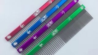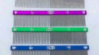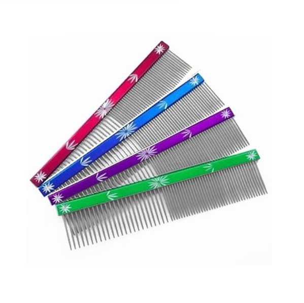 Grzebień z zębami ze stali nierdzewnej. Zęby rozstawione są w układzie 50/50, osadzone w płaskim, ozdobnym trzpieniu.