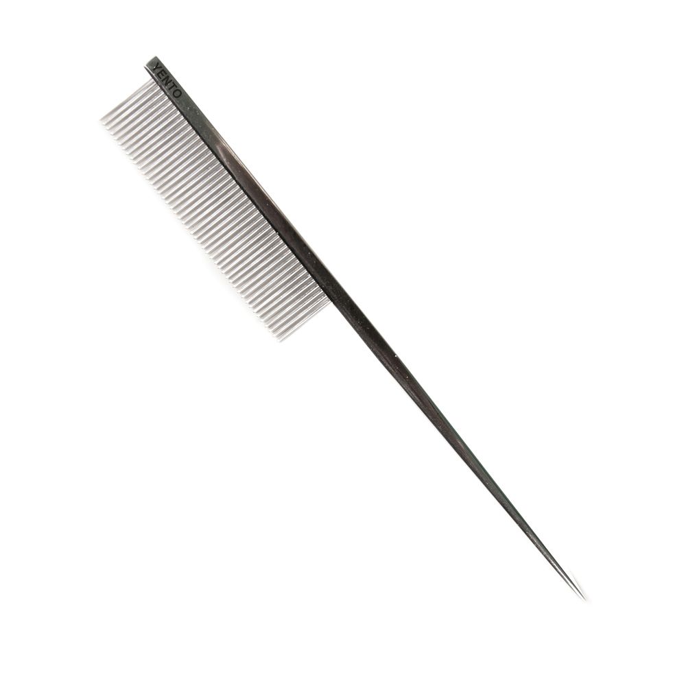 Grzebień igłowy Yento jest idealnym narzędziem do kołtunów i specjalnej stylizacji. Ten grzebień 18,5 cm ma mosiężny grzbiet z 46 chromowanymi zębami. Zęby mają długość 20 mm i są oddalone od siebie o 2 mm.