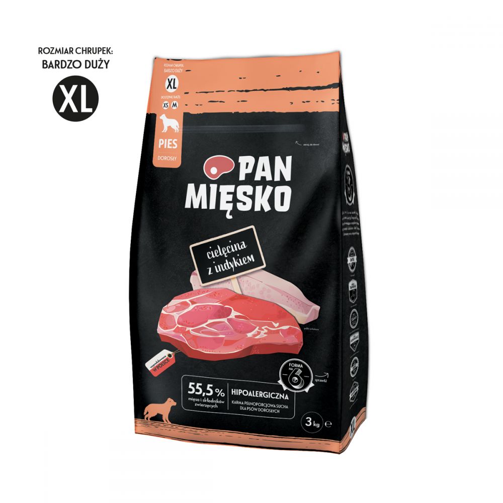 PAN MIĘSKO – CIELĘCINA Z INDYKIEM 3kg HIPOALERGICZNA KARMA PEŁNOPORCJOWA DLA DOROSŁYCH PSÓW