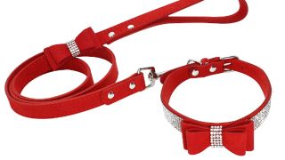 Uroczy zestaw obroża i smycz ozdobiony kokardką i cekinami. Wykonany z przyjemnego w dotyku materiału typu welur ozdobiony drobnymi, lśniącymi kryształkami. Zestaw sprawi, że Twój pupil będzie wyglądał pięknie i stylowo. Ozdobna smycz to znakomity dodatek do każdej stylizacji.