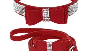 Uroczy zestaw obroża i smycz ozdobiony kokardką i cekinami. Wykonany z przyjemnego w dotyku materiału typu welur ozdobiony drobnymi, lśniącymi kryształkami. Zestaw sprawi, że Twój pupil będzie wyglądał pięknie i stylowo. Ozdobna smycz to znakomity dodatek do każdej stylizacji.