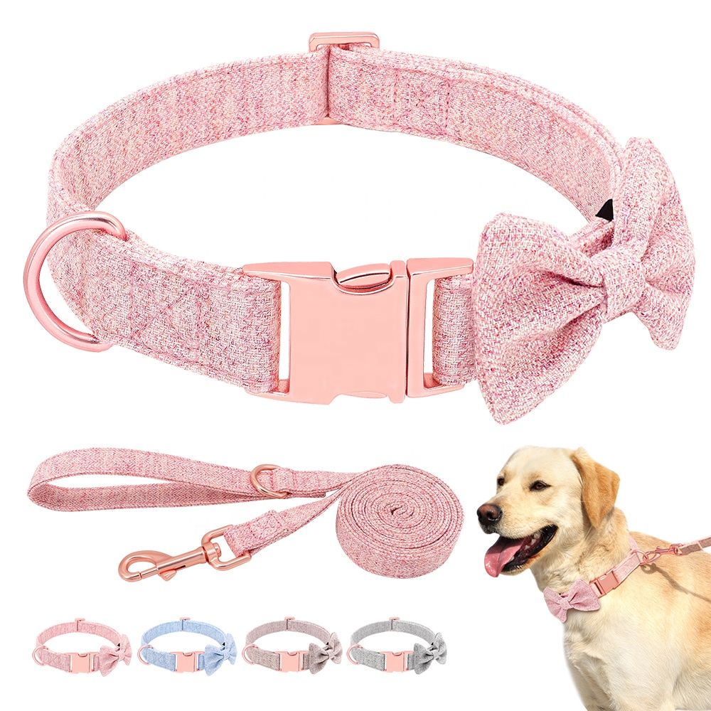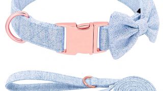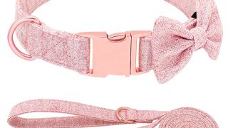 Starannie wykonany zestaw z obroża ozdobioną kokardą, którą można ściagnąć.