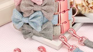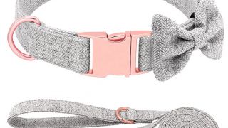 Starannie wykonany zestaw z obrożą ozdobioną kokardą, którą można ściagnąć.