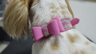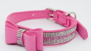 Obroża wykonana z delikatnego materiału typu welur, ozdobiona drobnymi kryształkami w kolorze białym i różowym.