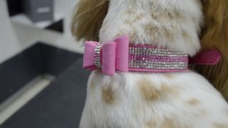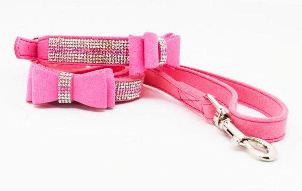 Komplet wykonany z delikatnego materiału typu welur. Obroża ozdobiona drobnymi kryształkami w kolorze białym i różowym, zapinana na standardową metalową klamrę.