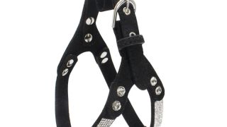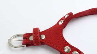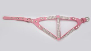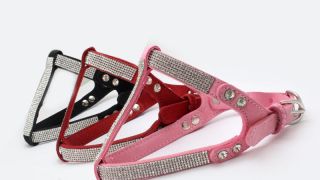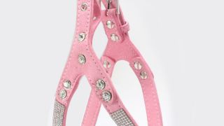 • Szelki dla psa w rozmiarze S, zapinane na grzbiecie srebrną klamrą, ozdobione cyrkoniami i kryształkami.