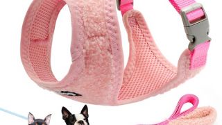 Szelki i smycz w dwóch kolorach: jasno różowym i jasno niebieskim.