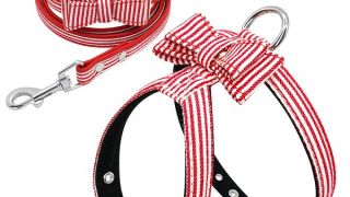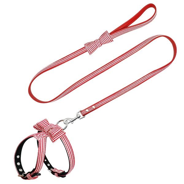 Komplet szelek ze smyczą w eleganckie czerwono białe pasy, smycz dodatkowo ozdobiona kokardą - muszką, polecamy dla małych psów.