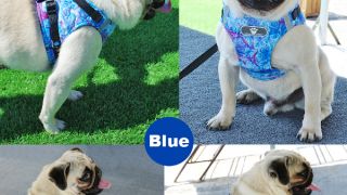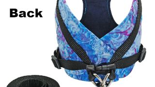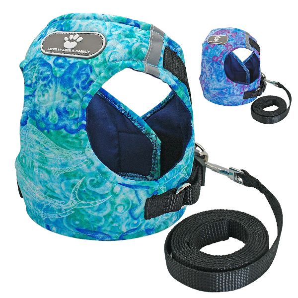 Komplet szelki i smycz dla małego psa lub kota. W zestawie znajdują się bezuciskowe szelki w pięknych niebiesko- zielonych kolorach i czarna smycz z taśmy o długości 150 cm zapinana na karabińczyk.