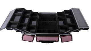 Mocna, uniwersalna walizka groomerska z 9 małymi, regulowanymi przegródkami plus duża powierzchnia w podstawie na cążki, butelki, szczotki itp.