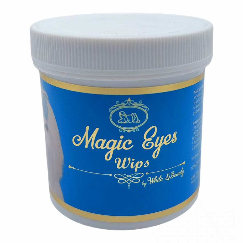 MAGIC EYES Wipes to nawilżane chusteczki stworzone do delikatnego oczyszczania okolic oczu u zwierząt. Idealne do usuwania przebarwień po łzach oraz innych zanieczyszczeń. Dzięki zawartości aloesu, chusteczki są łagodne dla wrażliwych oczu i bezpieczne zarówno dla psów, jak i kotów. Codzienne stosowanie pomaga zapobiegać nawrotom brązowych przebarwień wokół oczu.