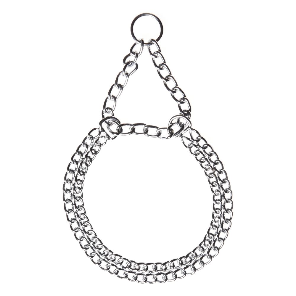 Chromowana stalowa obroża dla psa, składająca się z dwóch łańcuszków i systemu półzaciskowego, idealna dla psów z nawykiem ciągnięcia, wyposażona w pierścień mocujący.