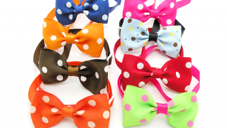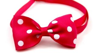 Zestaw pięknych muszek dla psa lub kota na tasiemce. Miękki i przyjemny materiał w dotyku. Kokardy w grochy w różnych kolorach. Znakomicie prezentują się na puilu.