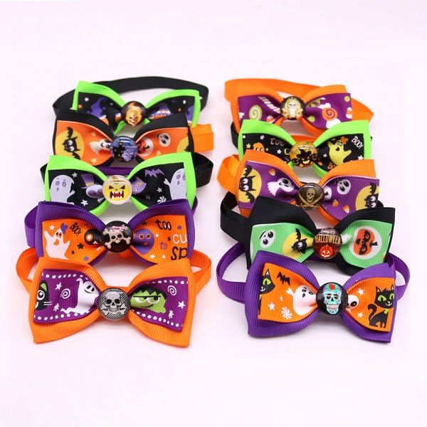 Komplet zawiera kolorowe, materiałowe muszki z motywami: dyni, nietoperzy, duszków, czaszek.