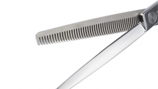 Nożyczki posiadają 45 precyzyjnych zębów, dzięki którym umożliwiają płynne cieniowanie bez szarpania sierści. Ergonomiczny uchwyt typu offset oraz stały hak pod palec zwiększają kontrolę nad narzędziem i zmniejszają zmęczenie dłoni.