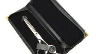 Nożyczki zapakowane w eleganckim, skóropodobnym futerale.