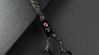 Nożyczki wyposażone są w ozdobną śrubę do regulacji napięcia oraz odkręcaną podpórkę pod palec, co pozwala na wygodne dopasowanie do techniki strzyżenia.