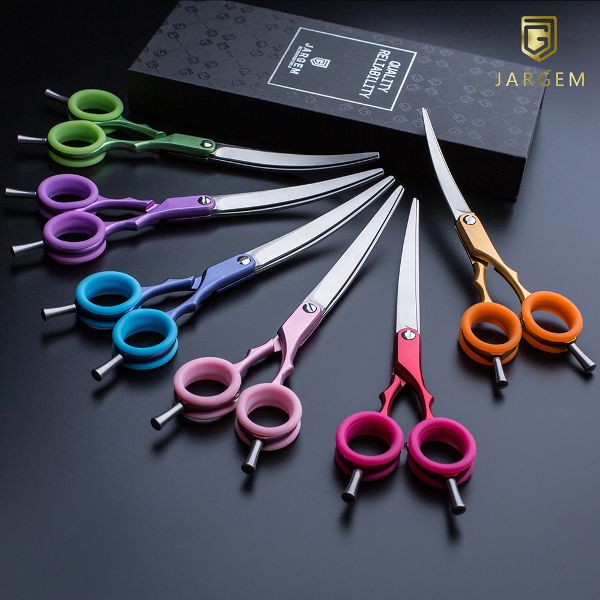 Profesjonalne gięte nożyczki do strzyżenia, idealnie nadają się do tworzenia zaokrąglonych powierzchni przy łapkach, na głowie itp. dzięki dużemu kątowi wygięcia nożyczek sprawdzają się do stylu asian oraz korean, gdzie tak pożądane są zaokrąglone precyzyjne cięcia.