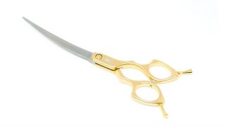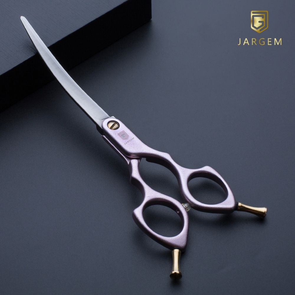 Profesjonalne gięte nożyczki do strzyżenia, idealnie nadają się do tworzenia zaokrąglonych powierzchni przy łapkach, na głowie itp. dzięki dużemu kątowi wygięcia nożyczek sprawdzają się do stylu asian oraz korean, gdzie tak pożądane są zaokrąglone precyzyjne cięcia.