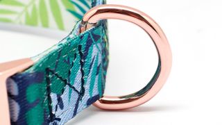 Obroża wykonana jest z kolorowej materiałowej taśmy. Posiada mocne, wytrzymałe złote okucia i klamry.
