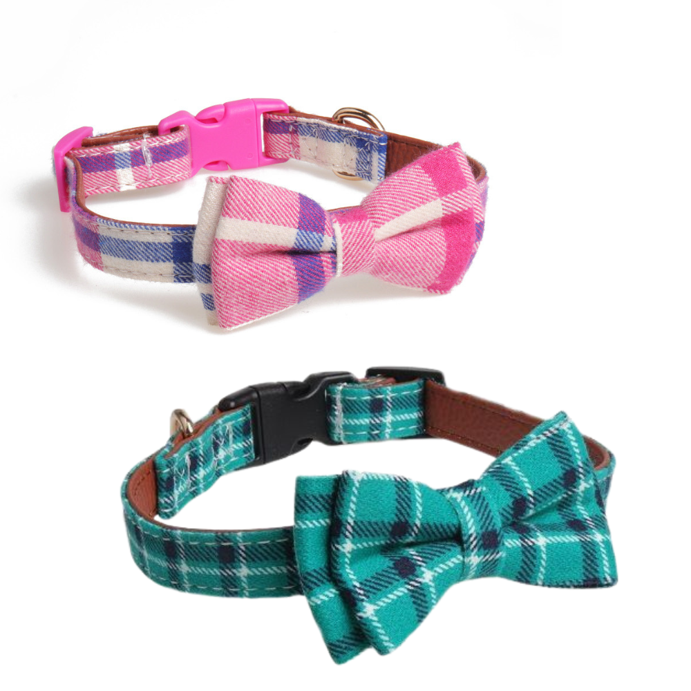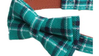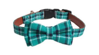Mucha jest w najmodniejszym teraz wzorze: ZIELONA LUB RÓŻOWA KRATA, która mocowana jest na dwóch gumkach dlatego można ją w razie potrzeby ściągnąć i mieć obrożę bez kokardy.