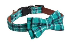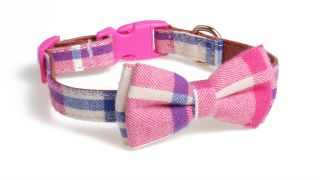 Mucha jest w najmodniejszym teraz wzorze: ZIELONA LUB RÓŻOWA KRATA, która mocowana jest na dwóch gumkach dlatego można ją w razie potrzeby ściągnąć i mieć obrożę bez kokardy.