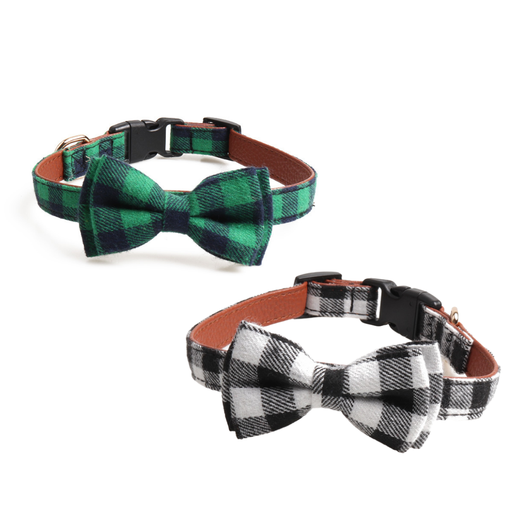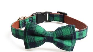 Mucha jest w najmodniejszym teraz wzorze: ZIELONO CZARNA LUB BIAŁO CZARNA KRATA, która mocowana jest na dwóch gumkach dlatego można ją w razie potrzeby ściągnąć i mieć obrożę bez kokardy.