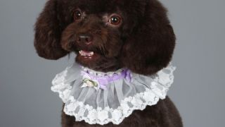 Elegancka, biała, haftowana koronka dla psa lub kota ozdobiona jest fioletową atłasową wstążką oraz perełkami, które dodają mu wyjątkowego uroku.