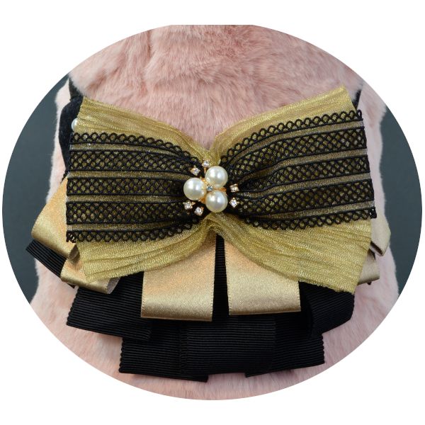 Piękna czarno-złota kokarda, zdobiona perełkami i kryształkami. Wiązana atłasową tasiemką.