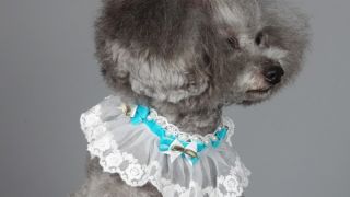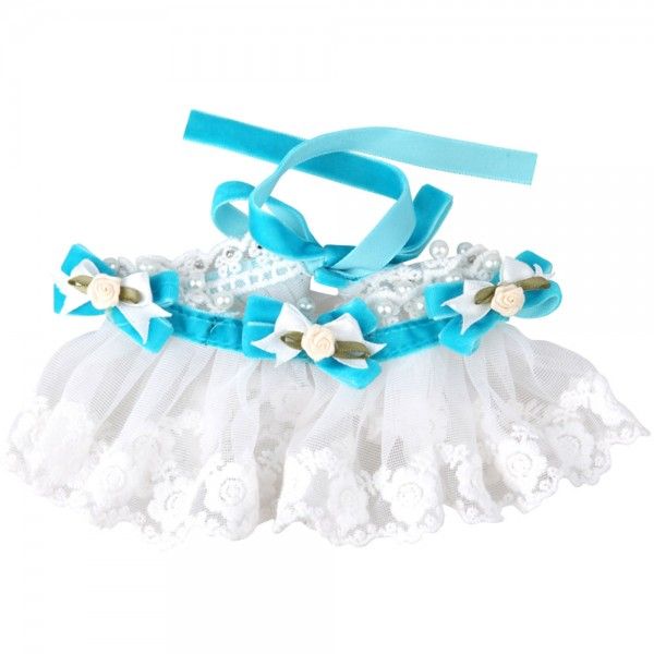 Elegancja biała haftowana koronka ozdobiona niebieską atłasową wstążką i perełkami.