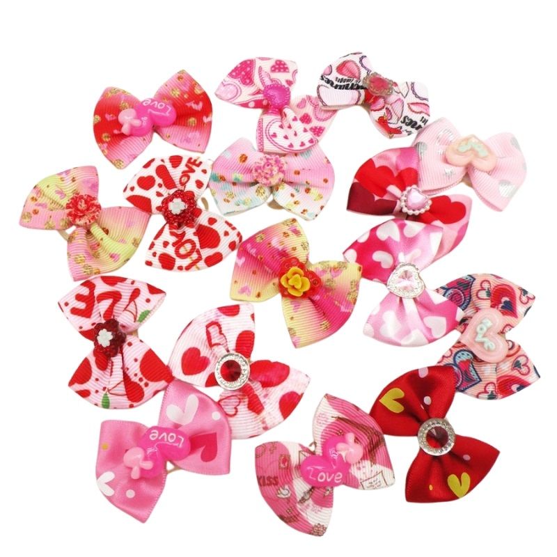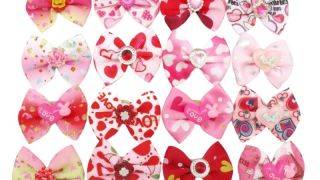 Śliczny zestaw pięciu kokardek w różowym odcieniu z motywem serduszek, które są idealnym dodatkiem do wykonania słodkiej kitki dla Twojego pupila. Każda kokardka przyciąga uwagę ozdobą na środku, dodając uroku każdej stylizacji. Mocowane na silikonowych gumeczkach, są łatwe w użyciu i wygodne dla psa.