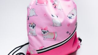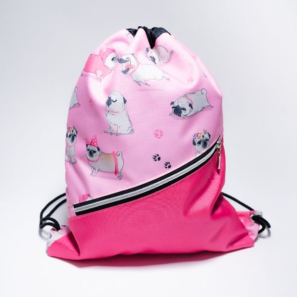 Różowy workoplecak z motywem piesków mopsów. Plecak, torba na plecy.