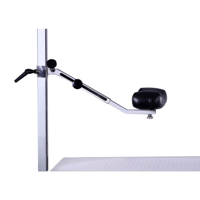 Comfort Rest oferuje wszechstronne wsparcie zarówno dla głowy, jak i brzucha. Instalacja jest prosta: wystarczy odkręcić śrubę ramy stołu i przesunąć Comfort Rest na nią. Ten przyjazny użytkownikowi dodatek łatwo mocuje się do słupka sterującego i można go regulować dla różnych ras psów i wysokości, poprawiając doświadczenie w pielęgnacji dzięki swojej prostocie i elastyczności.