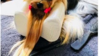 Poduszka z pianki memory do podtrzymywania głowy psa podczas pracy.