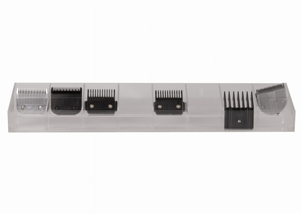 Przeźroczysta półka naścienna na 16 ostrzy, kompatybilna z ostrzami typu snap-on wszystkich firm. Idealna do każdego salonu groomerskiego. Zestaw zawiera dwa kołki do montażu.