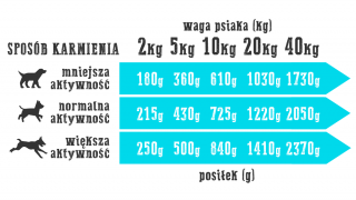- Świeży olej z łososia - bogactwo kwasów tłuszczowych Omega 3 EPA i DHA, cennych dla sierści i skóry Twojego psa.